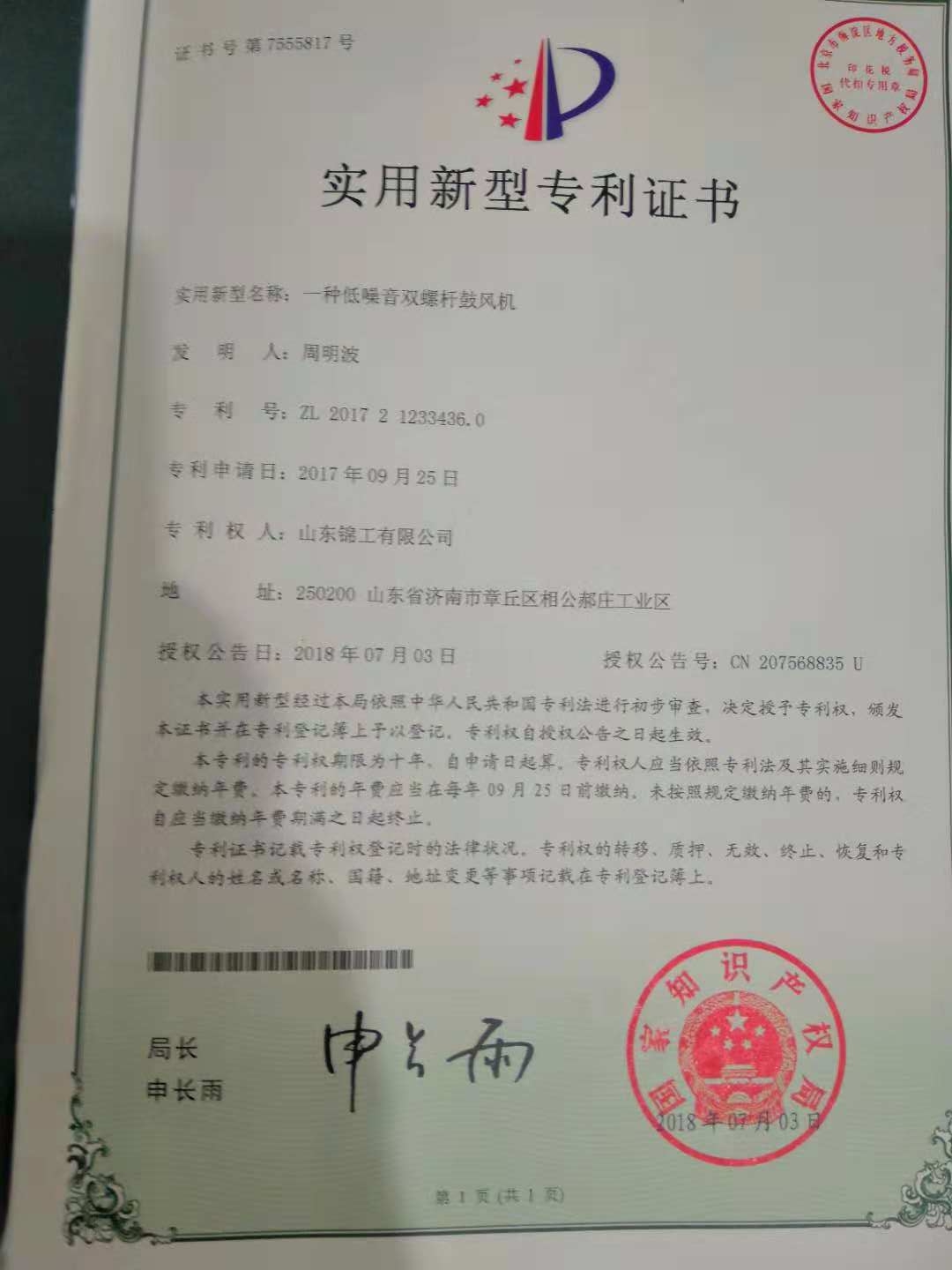 日前,錦工風(fēng)機(jī)的“一種雙螺桿鼓風(fēng)機(jī)” 、“一種緊湊型羅茨鼓風(fēng)機(jī)” 、 “羅茨風(fēng)機(jī)選型軟件” 等獲國(guó)家知識(shí)產(chǎn)權(quán)局頒發(fā)的專利及軟著證書。