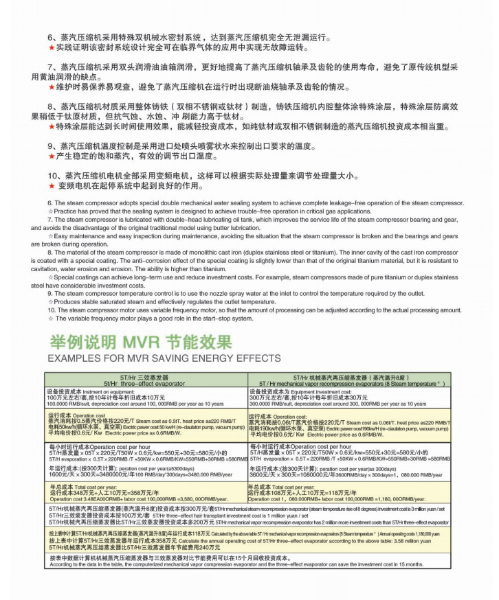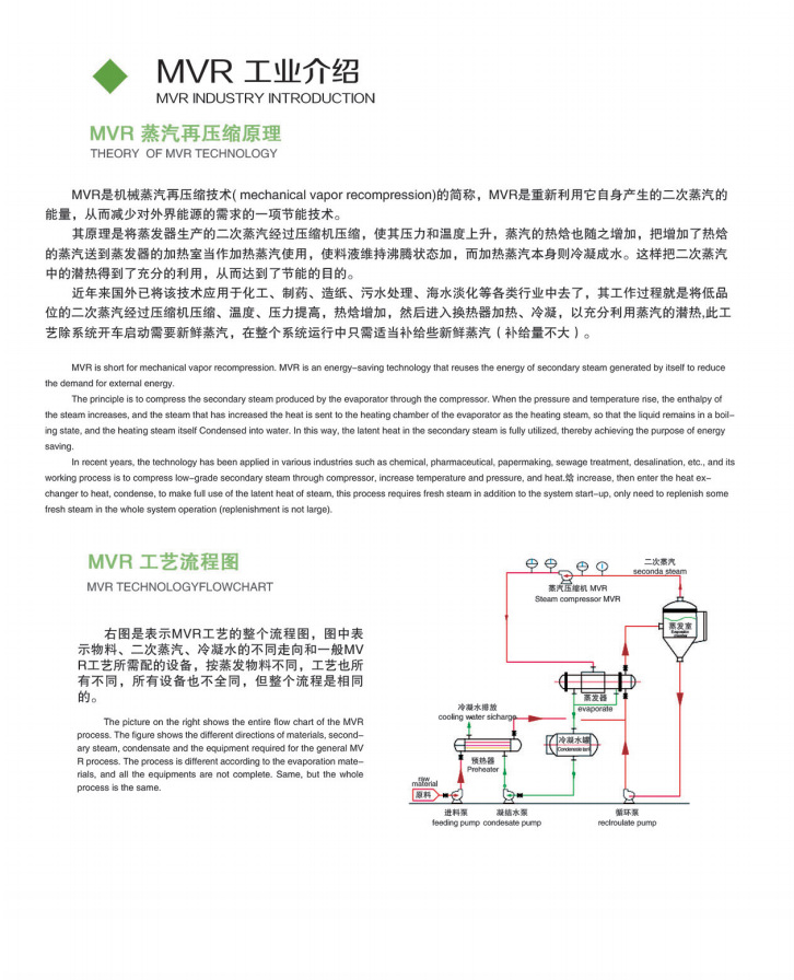 MVR是機械蒸汽再壓縮技術(mechanical vapor recompression)的簡稱,MVR是重新利用它自身產生的二次蒸汽的能置,從而減少對外界能源的需求的一項節能技術。